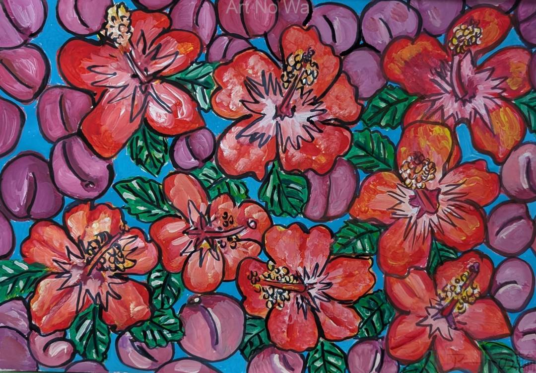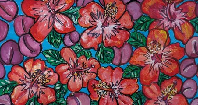 夏といえばハイビスカス。知り合いから貰って食べたプラムが美味しかったのでバックに書き足した。