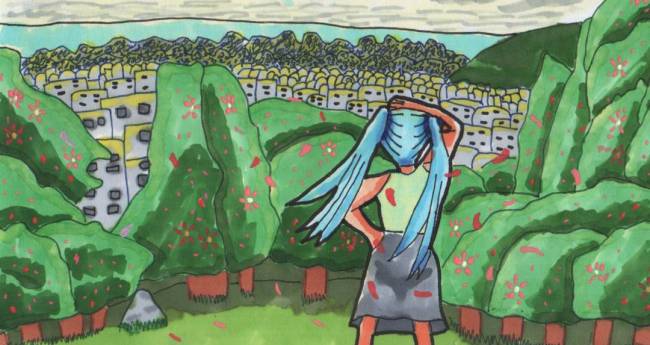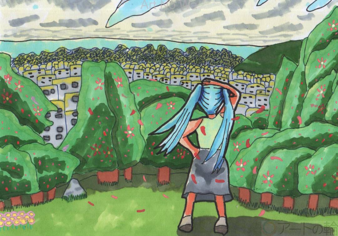 緑生い茂る木々に花が咲き乱れている様子を描きました