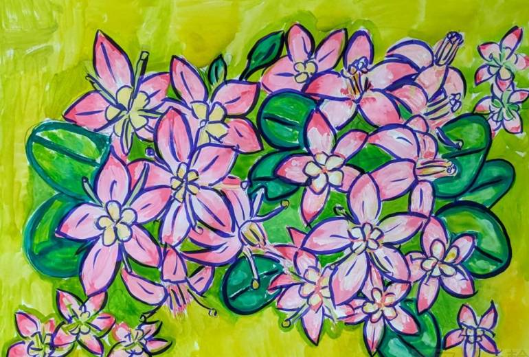 小学3年生の頃学校の先生が読書感想画のコンクールをすすめて参加したら入賞したきっかけで母のすすめもあり絵を描くのが好きになりました。特に花が好きで紙に大好きな花…