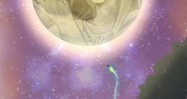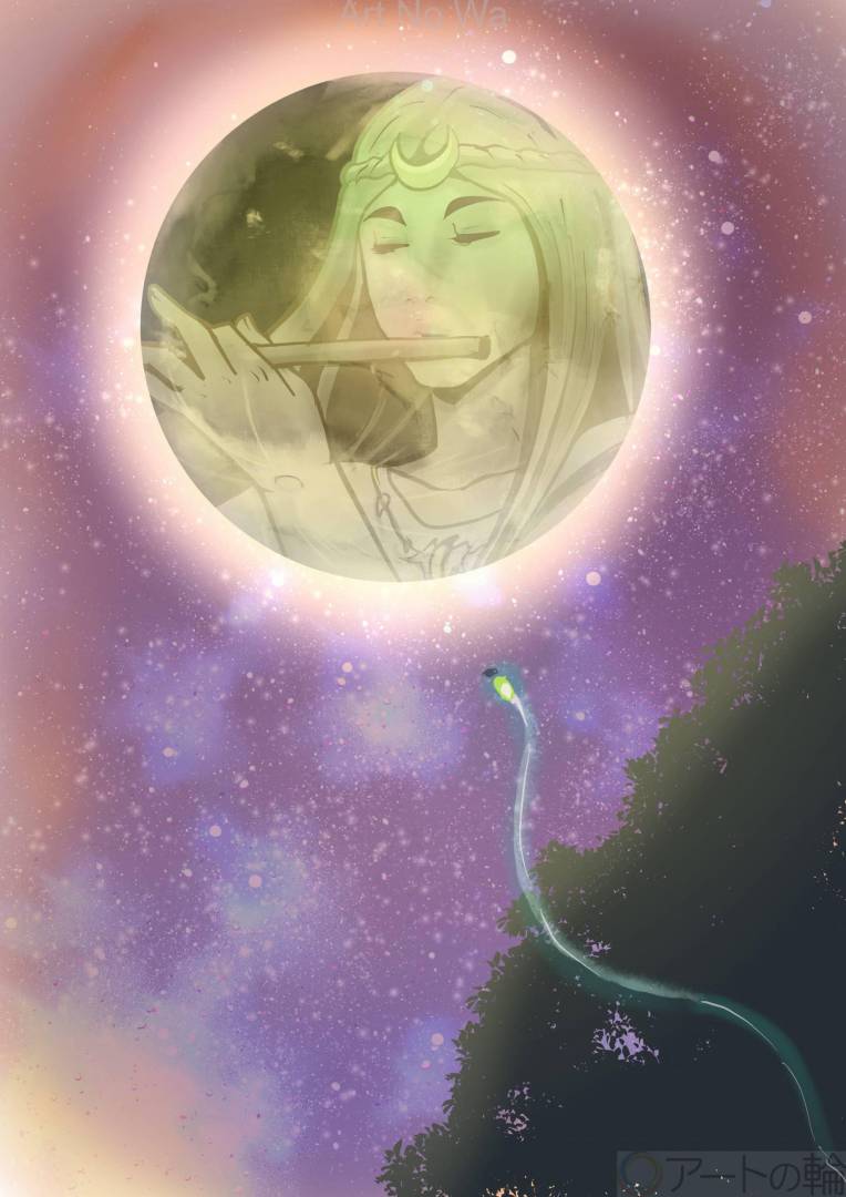 月の出ている夜にツクヨミ様がお笛を吹いて夜の闇を照らしてるの図