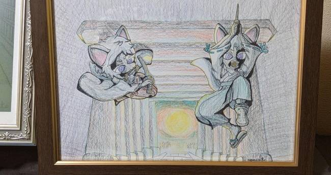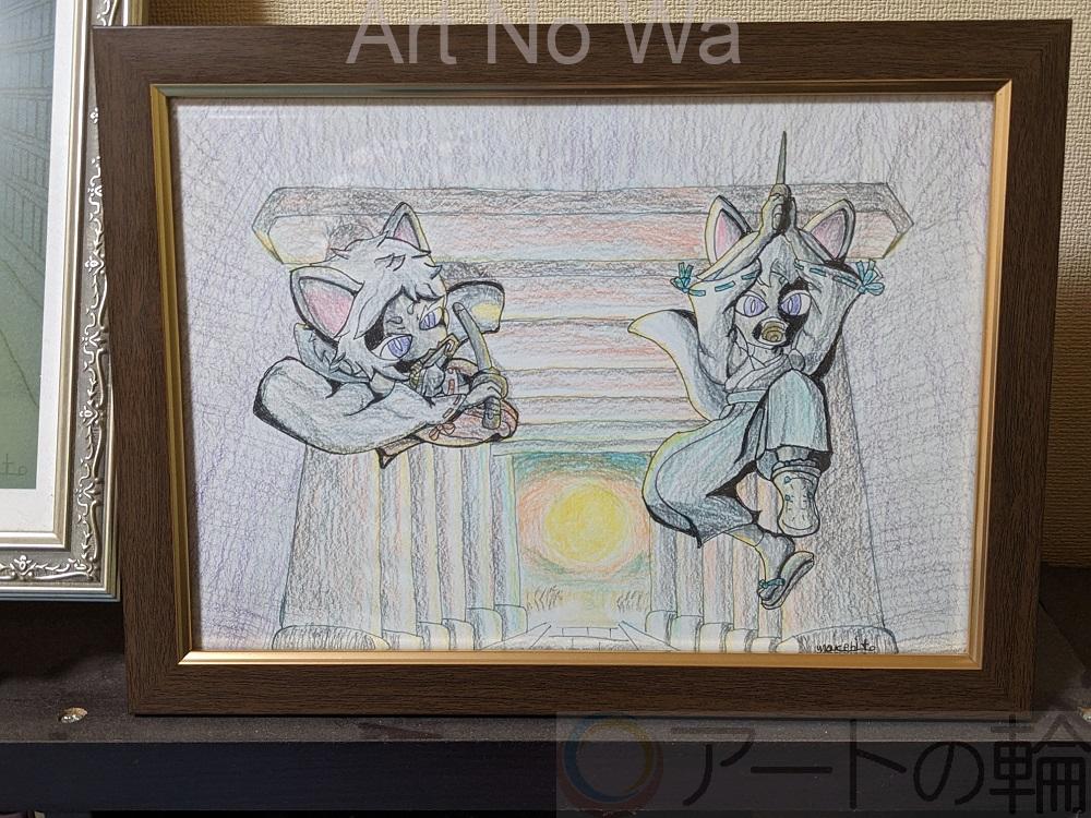 狛狐さんの仕事風景、招かれざる客が来たようです。A4紙サイズ。