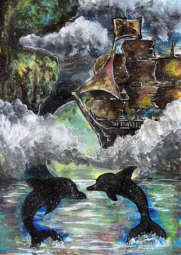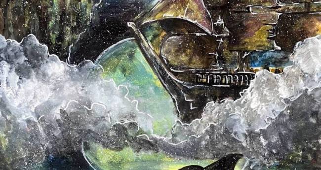 空を泳ぐ海賊船や浮かぶ島、幻想世界からやってきた旅人が見た景色を表現しました。