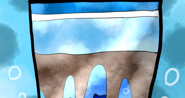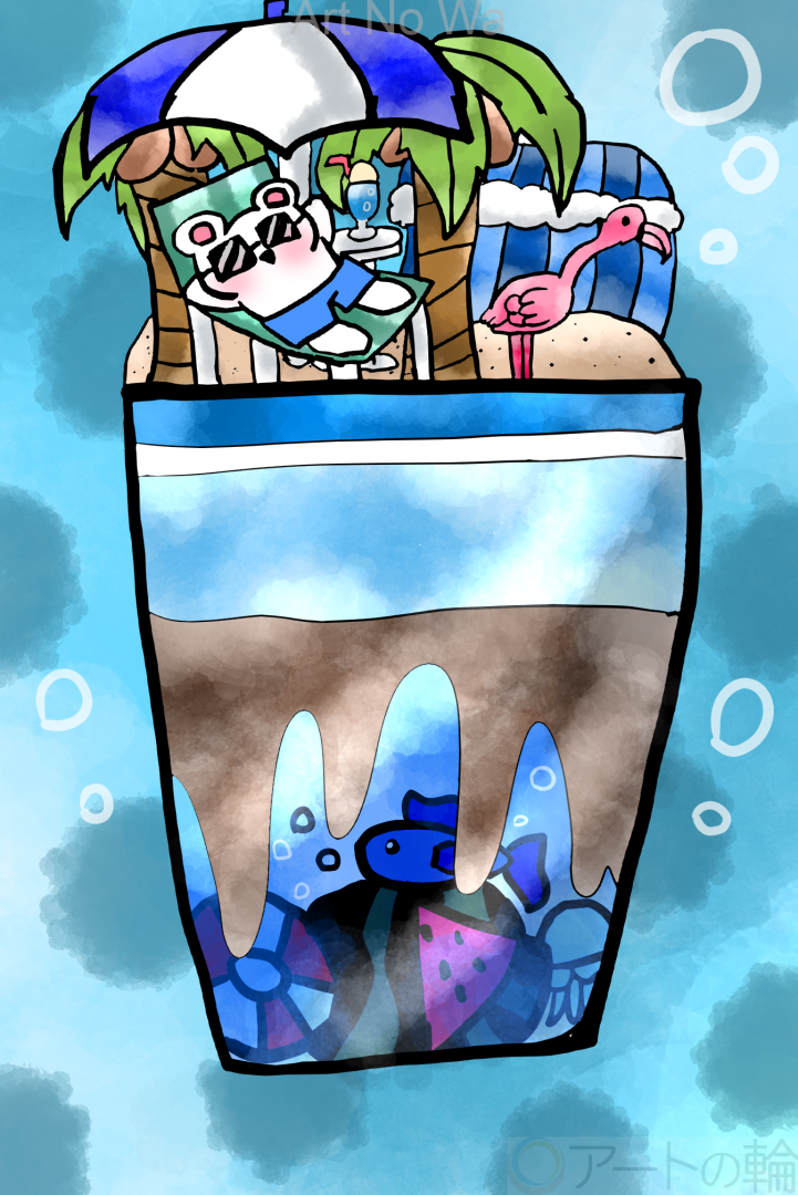 ジュースの底に夏の思い出のものが色々沈んでいる海っぽい色が爽やかなジュースを想像しながら描いてみました。上では白くまがサングラスをかけてくつろいでます。