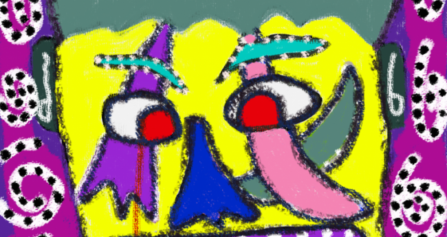 非現実,屋内,過去,レトロ,黄色,緑,紫,人物,子供,かわいい,どきどき,2D
