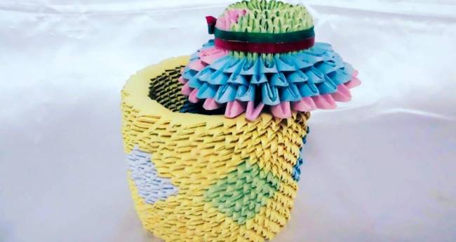 ひまわり畑を風に乗って飛ぶ帽子を表現した小物入れを作りました。