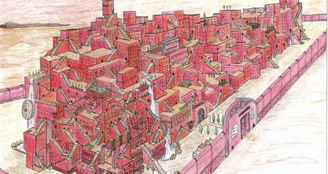 カスバとは北アフリカやスペインに見られる城塞や城塞に囲まれた居住地区を指す言葉です。カスバに階段をたくさんコラージュして、非現実的なカスバを描いてみました。