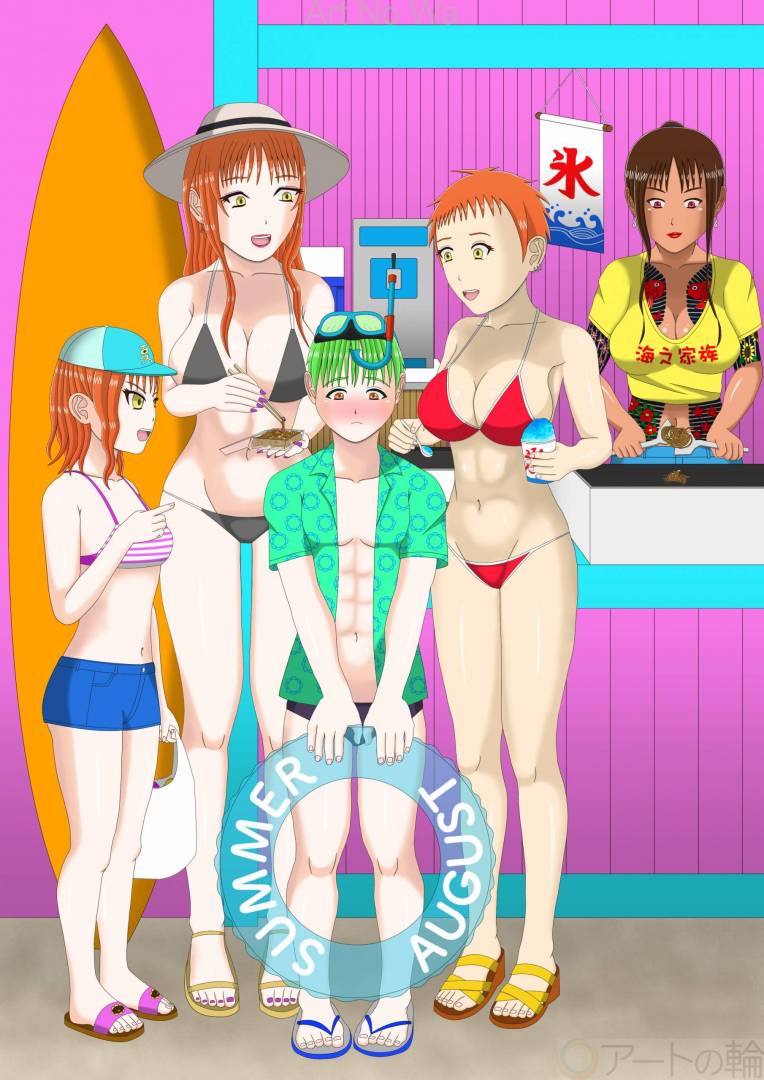 現実,屋内,屋外,海,夏,オレンジ,緑,水色,人物,女性,子供,明るい,たのしい,かわいい