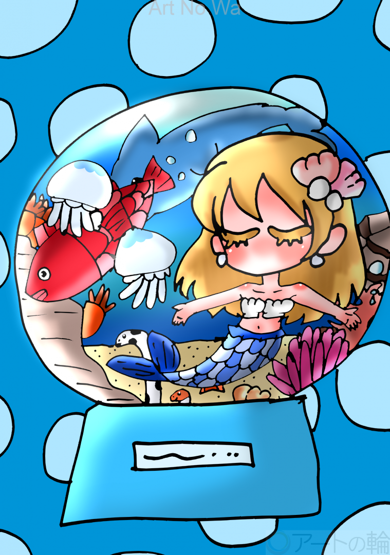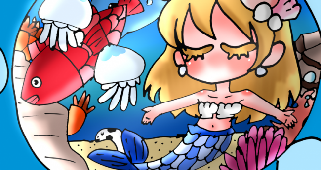 秋に引き続き、夏バージョンも描いてみました。魚たちが楽しく泳いでいる海の中で人魚が歌っている様子を描いてみました。