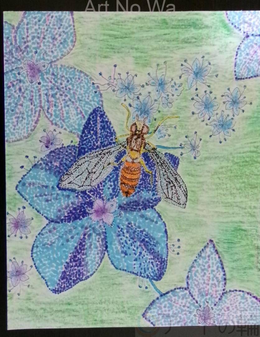 6月30日に、定義さんへお邪魔した際、真の花が咲いて入た紫陽花に、ハナアブさんが止まってたのをカメラで撮って来ておりまして、を参考に点描画風⁺なイラストにして見ました。