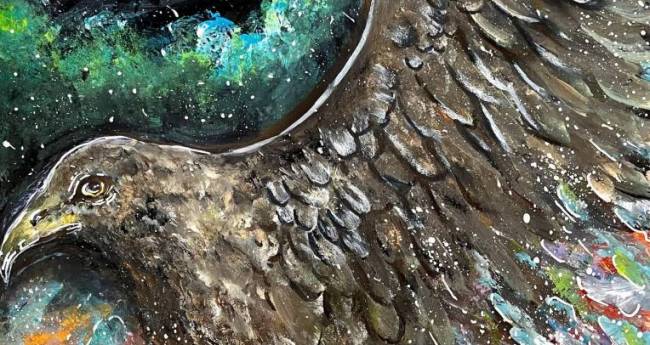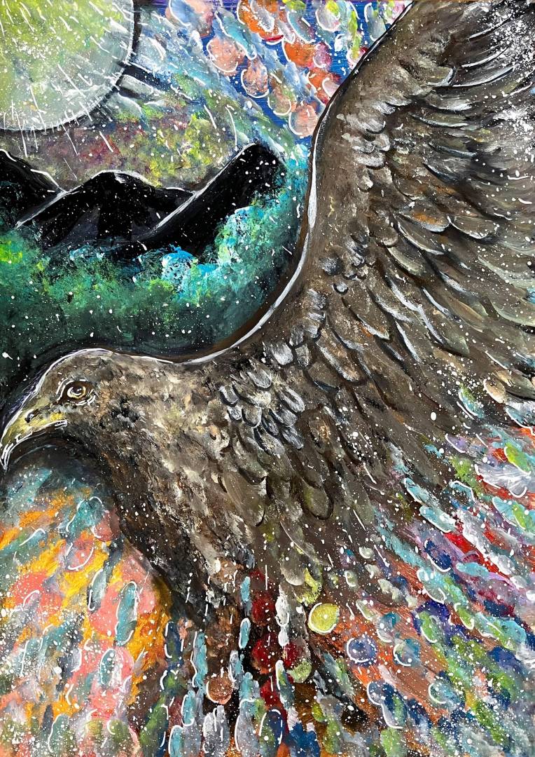 希望の光を纏って夜空を飛ぶ鳥を描きました。カラフルな光の粒を纏い明るい未来を導いてくれそうです。
