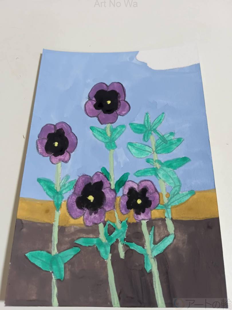春に咲いたぱんじーはとても可愛らしく可憐に咲いていました。思わず絵にしてしまいました。描いたのは夏の朝です。力強い花の感じを縁取りで表しました。