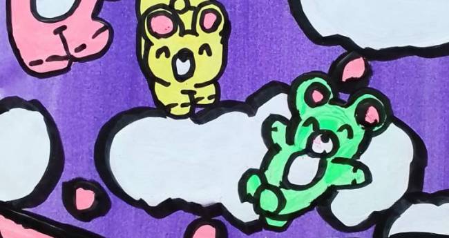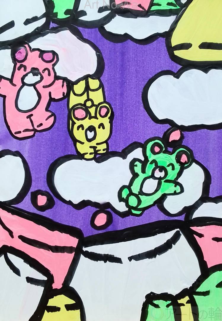 マシュマロでトランポリンのように遊んでいる熊を描いてみました。