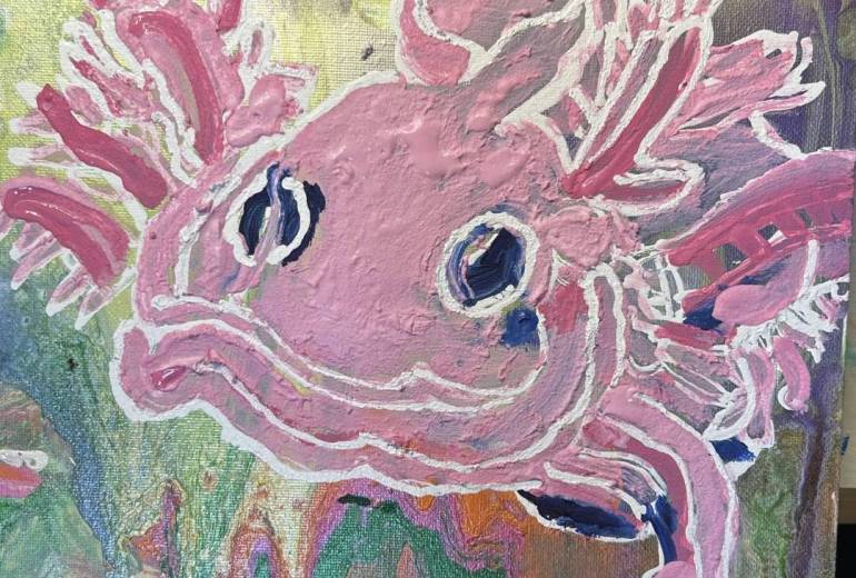 知的障がいがあり、10歳より絵画の教室に通う。 14年間絵画を学び今年の春より自分の好きなように描き始める。個展3回開催 毎回100名以上の方々が来場される。