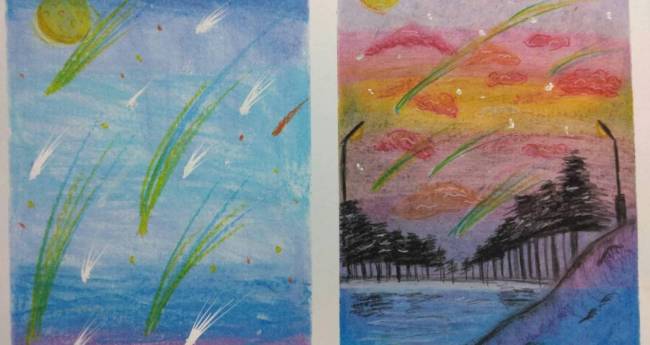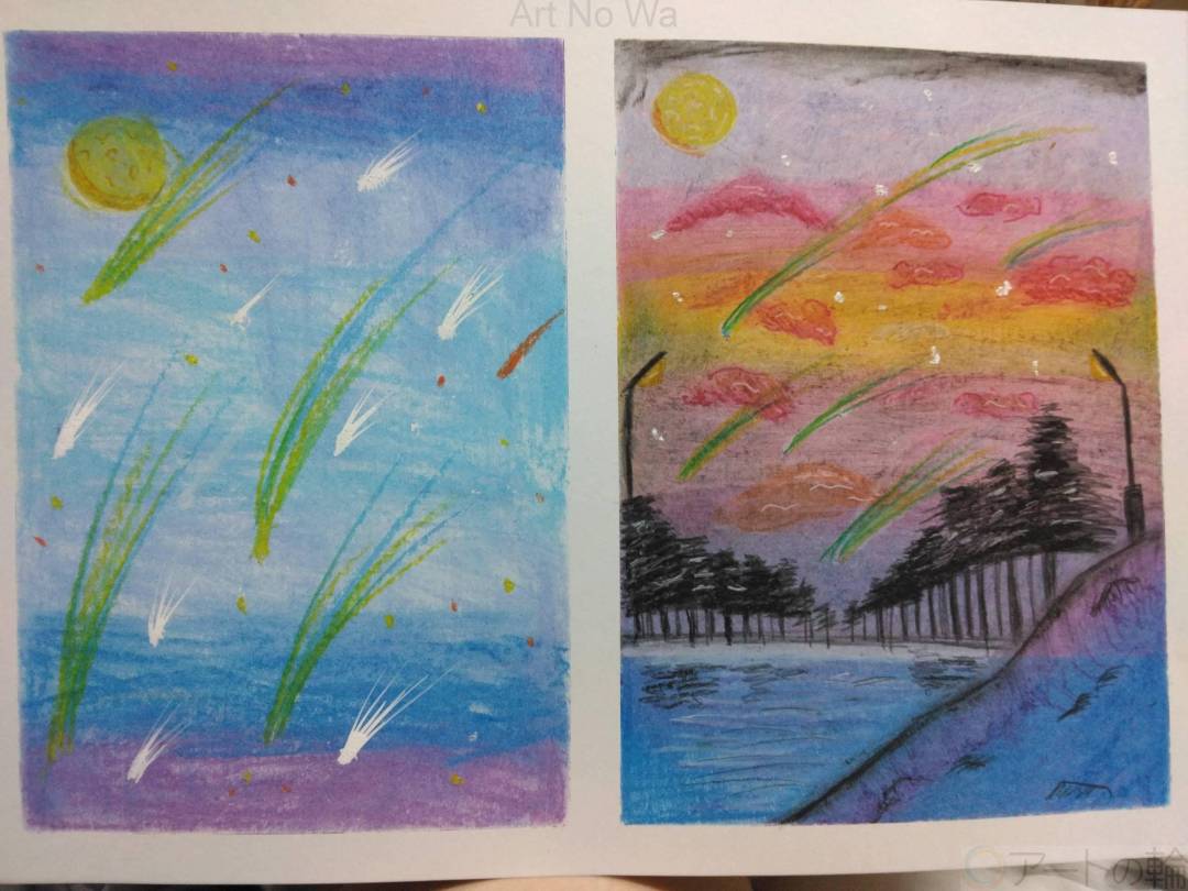 クレヨンでグラデーションをして星々が流れ落ちる様子を描きました。