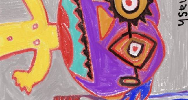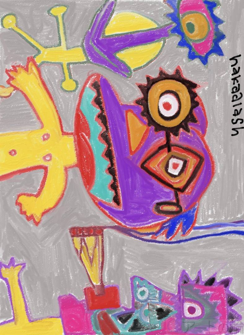 非現実,屋内,外国,過去,レトロ,黄色,紫,人物,想像上の生き物,男性,大人,明るい,たのしい,2D