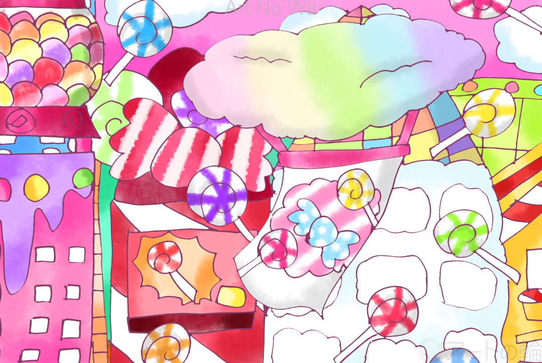 天気の雨が降るのではなくお菓子の飴が降ってくる不思議なキャンディの街を描いてみました。