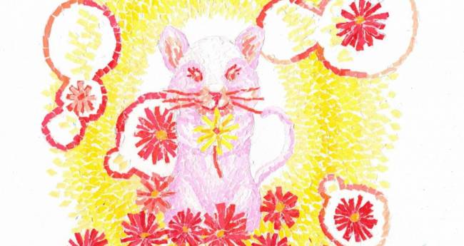お花に囲まれて、お花を持ったネズミが、こちらを向いて笑っています。つぶらな瞳で見つめるネズミ。思わず手を振りたくなる様な可愛いらしさを目指して、ちぎり絵にしました。