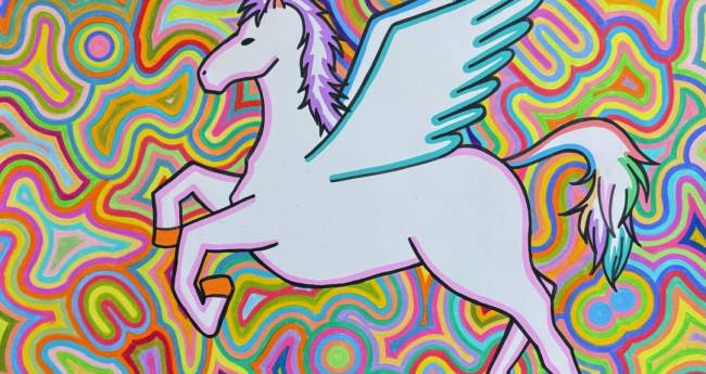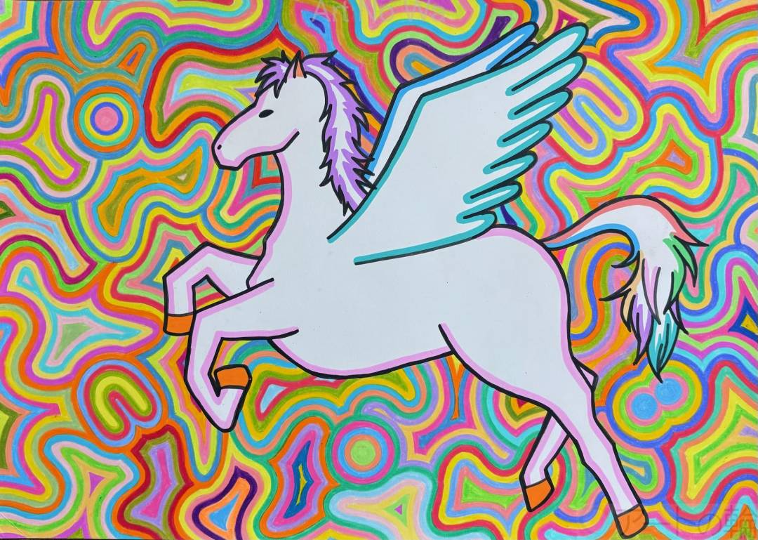 カラフルな空を駆けるペガサスを描きました。