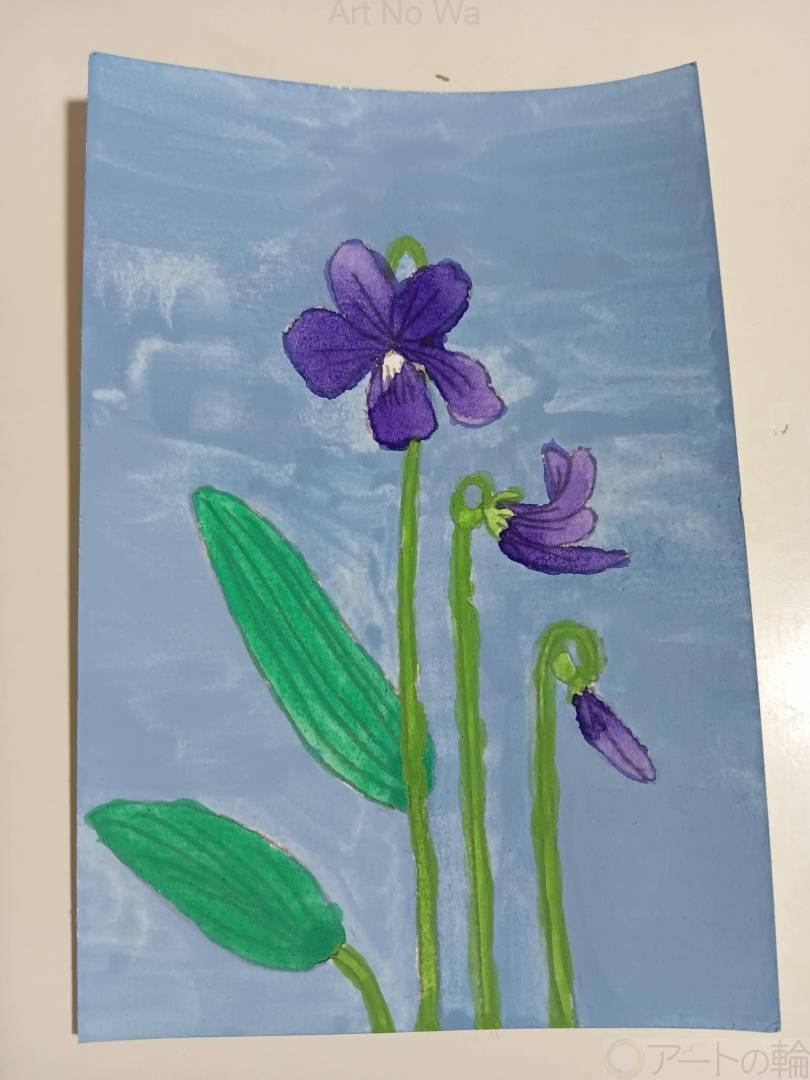 春に道端に咲くスミレの花を描きました。とても可憐で淡い紫色が素敵で絵にしてみました。淡い色使いが決まりとても良く発色しています。