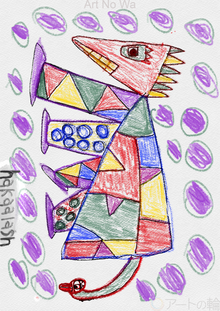 非現実,屋外,外国,山,過去,レトロ,赤,黄色,緑,青,紫,動物,想像上の生き物,明るい,たのしい,かわいい,わくわく,どきどき,2D