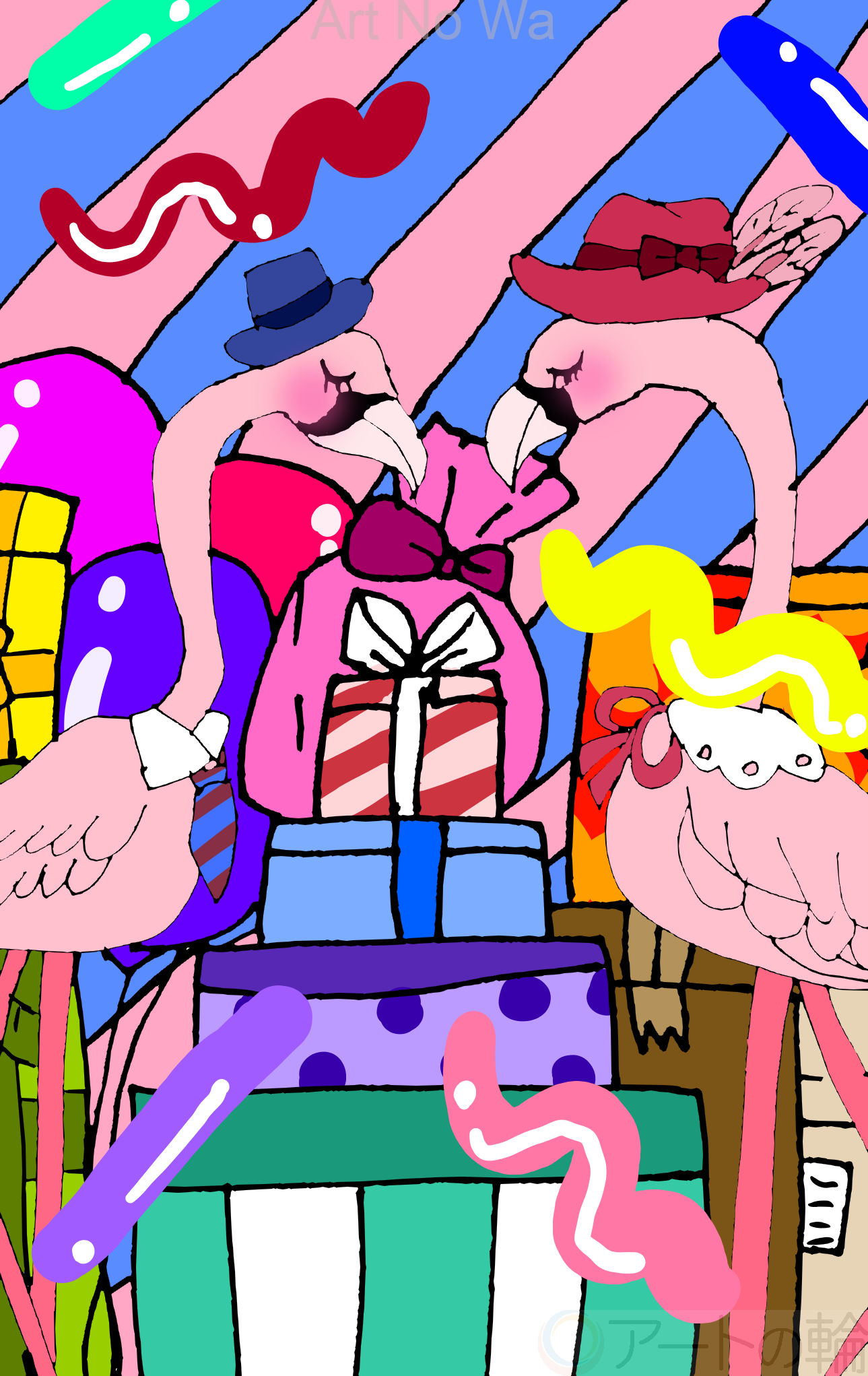 沢山のプレゼントに囲まれて嬉しそうな2羽の男女のフラミンゴを描いてみました。