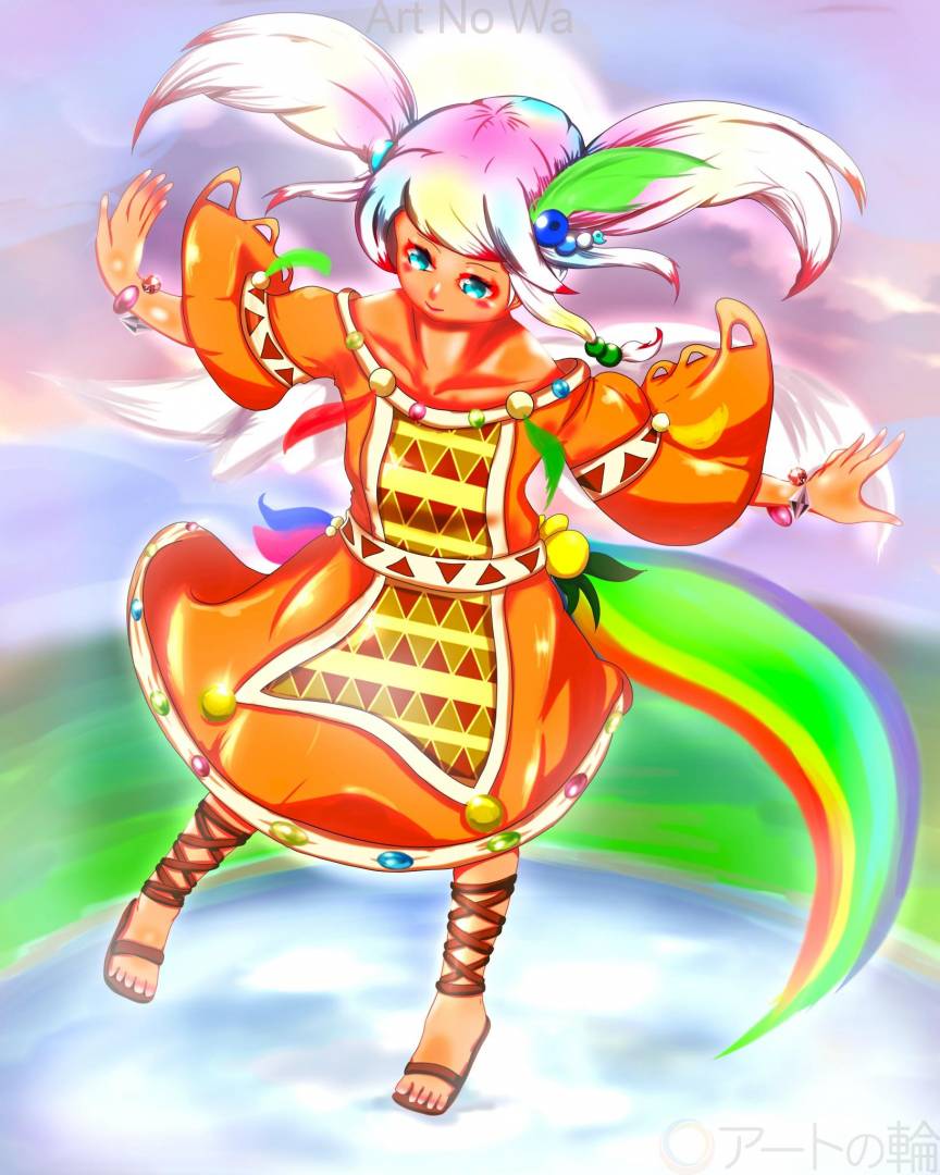屋外,湖,赤,オレンジ,緑,水色,人物,風景,女性,明るい,かわいい,2D