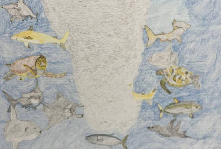 イワシトルネードの回りを泳ぐ海の仲間たち