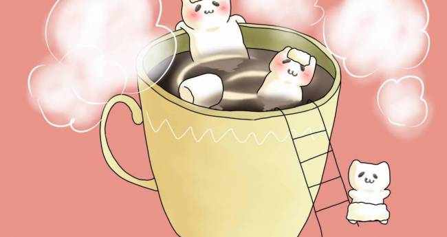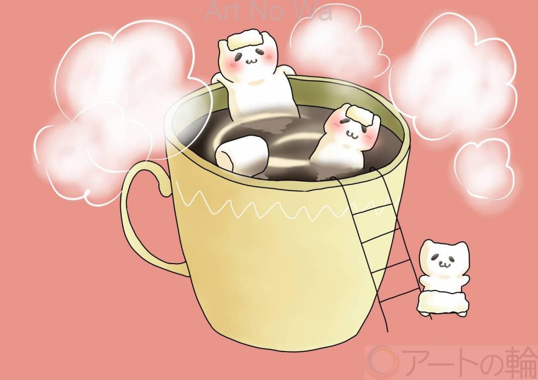 猫の形のマシュマロたちがホットココアに浸かって温まっています。