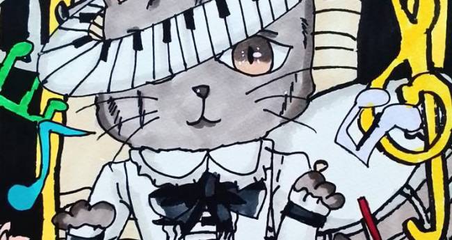 前脚で鍵盤の音感を感じている猫の女の子を描いてみました。