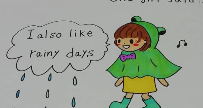 小さい時、雨の日には長靴はいてカッパ着ていつもと違うのをワクワクしてた思い出を絵に表現しました