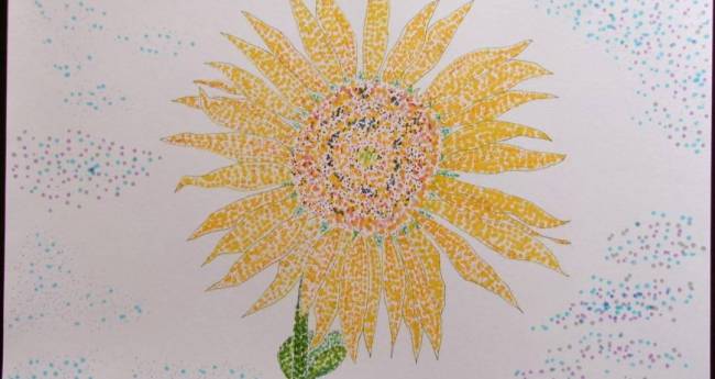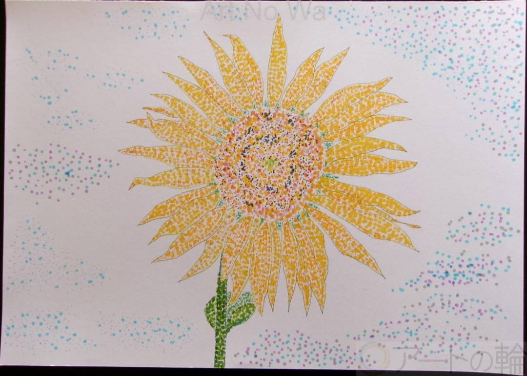 8月22日11:30頃に、おおくま花畑(亘理町)で撮って来て入た真っ盛りな向日葵を参考にし、点描イラストにして見ましたです。で、気温を調べて見ると、30℃未満(28℃台)だったから、真夏日では無かったんだけど、真夏日以上な感じも、の、以前も書いたが、「阿武隈川の川風は心地好かった」は、土手に立って向日葵を見渡して感じたのでした。