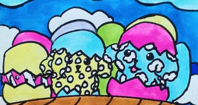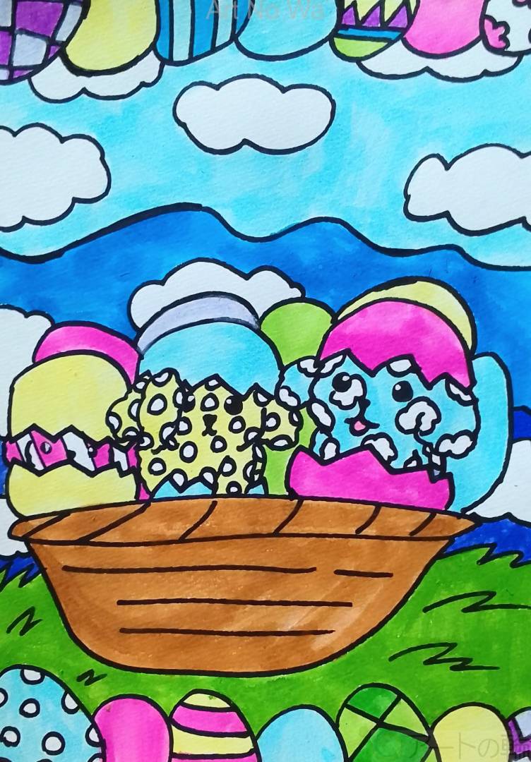 イースターエッグの中に入って楽しんでいる3匹のプードルを描いてみました。