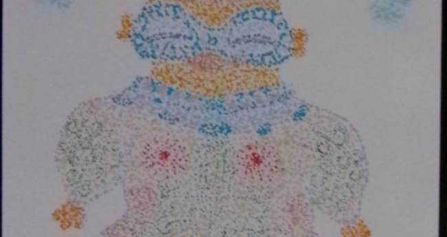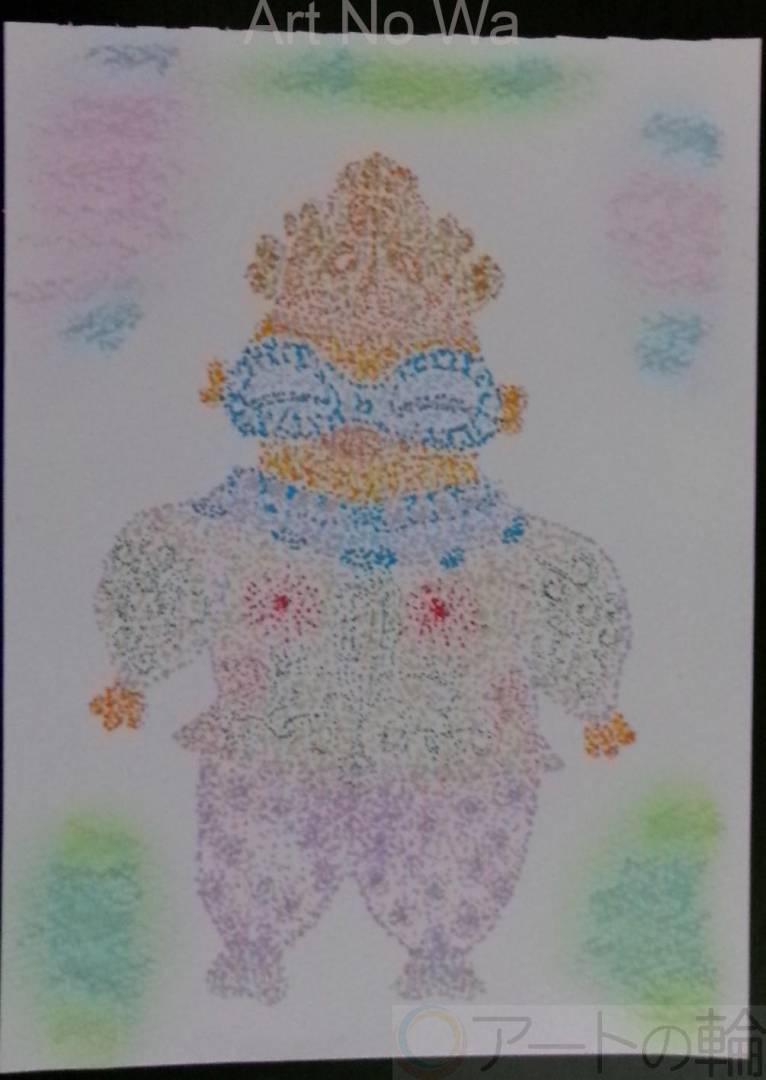 頭に浮かんだまんまに、遮光器土偶さんが、真夏日和にお散歩して入るイメージを、下描き無しの点描イラストにして見ましたです。で、今日(9/2)のDCプログラム内に、遮光器土偶さんは仕上げて来て+お家でクレヨンでちょい背景に彩りを。