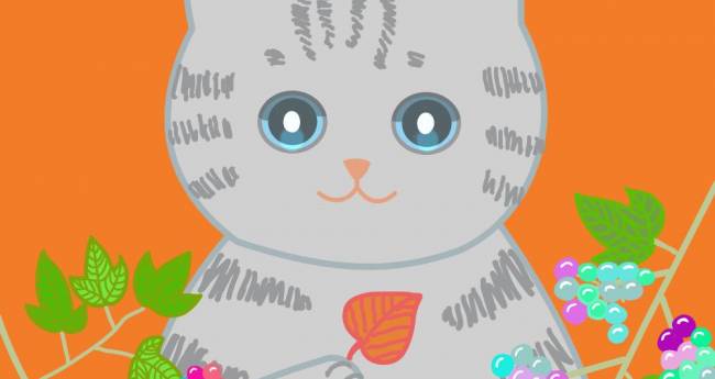 なかなかやって来ない秋を想い、描きました。しましまネコくんは、紅葉を持って、カラフルなノブドウの実に囲まれています。絵の中だけ、秋が来ています。