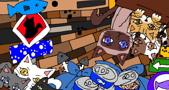 路地裏にある植木鉢に入って楽しくしている可愛い野良猫達を描いてみました。