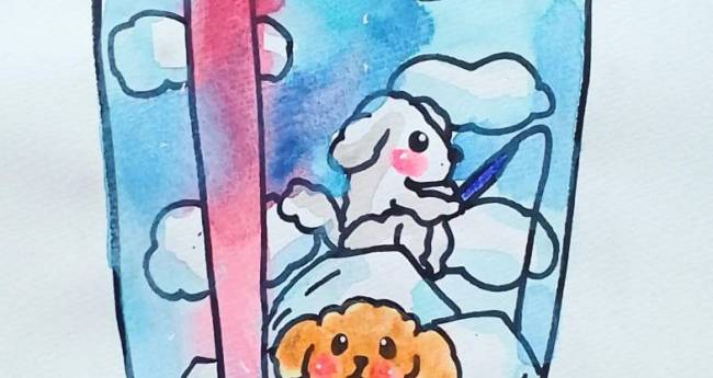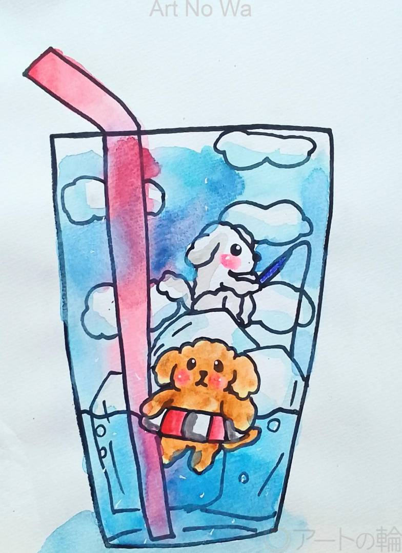 真夏の海をイメージして浮き輪で海に浮かんでいるプードルと釣りをしているプードルを描いてみました。