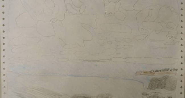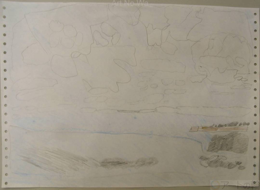 空のくもがパズルのようにかさなっていたり、なみが大きくゆれているところをえがきました。