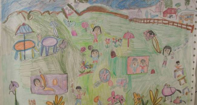 海といろいろあってきれいなところです。いえもおしゃれにかきました。花もおすすめです。たこもあげられてます。