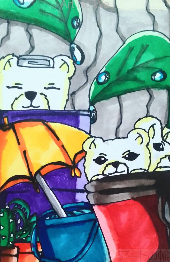 洞窟の中でドラム缶のお風呂に入ったり、くっついて一緒に長靴の中で過ごしたりなどで雨宿りしている白くまの子供を描いてみました。