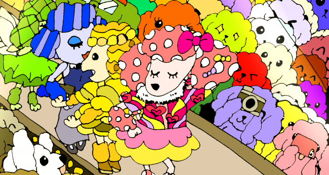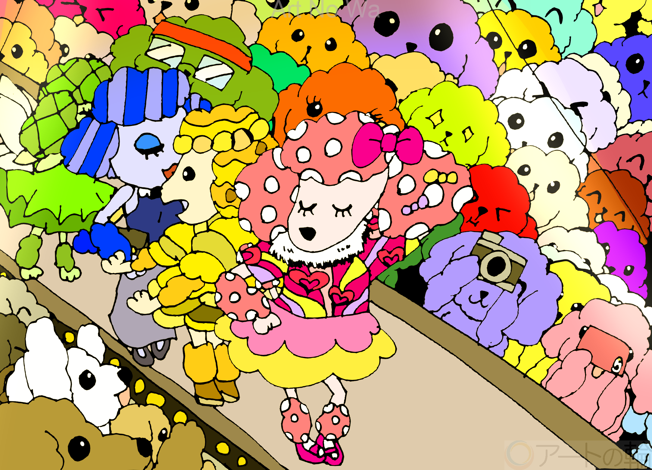 ランウェイを歩いているモデルのプードル達と観客のプードルを描いてみました。