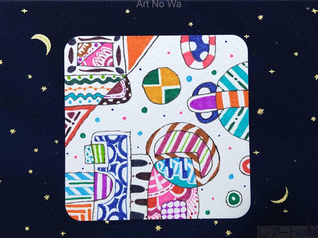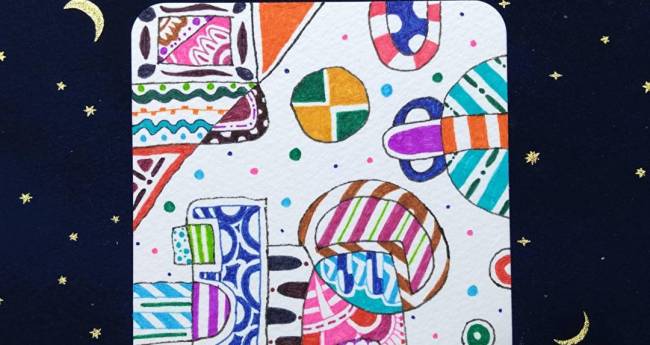 天に浮く、星の住処。小さな点が星で、マリモのように生きていてここでは星も徐々に大きくなる。周りのカラフルな住み処に立ち寄ることで食べたり眠ったり、ゆっくりした時間を過ごせる。そんなひと時をイメージして描いた。
