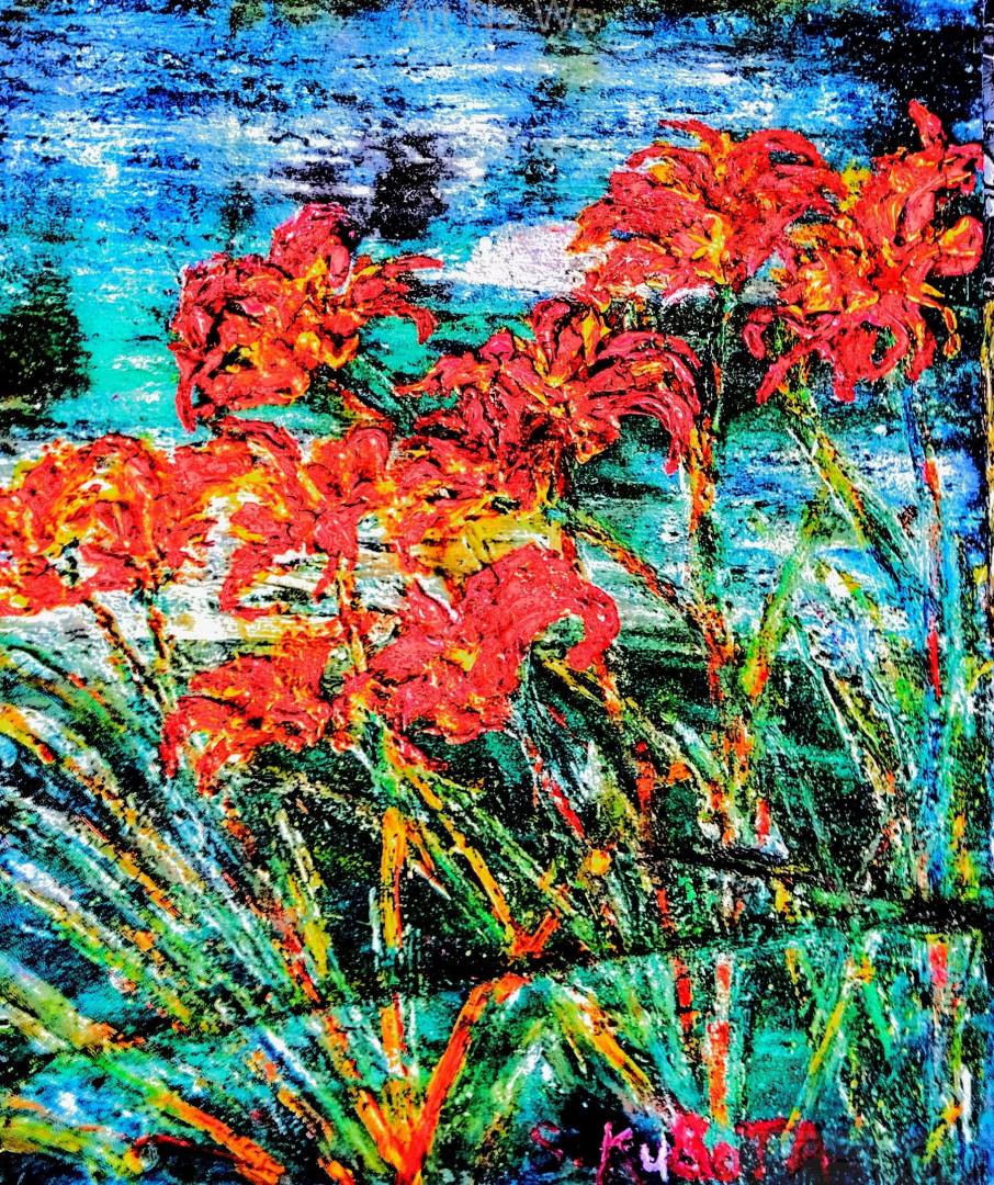 この作品は、日光黄菅を描いたので彼岸花じゃあ無いんだけどどっちもドッチだよ。せう云えばぼくの贋作が売っていたよ。はな。の絵画。ドーナッツてるの金。メルカリでいま、オークションに描けて有るけども、うれ無いよ〜ん。