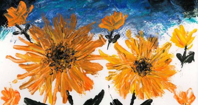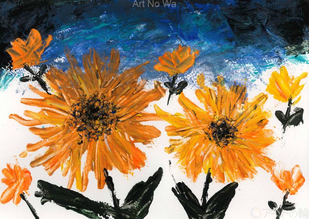 以前訪れた、夕暮れから夜になっていく静けさの中のひまわり畑を思い出して描きました。ペインティングナイフを使用して描きました。