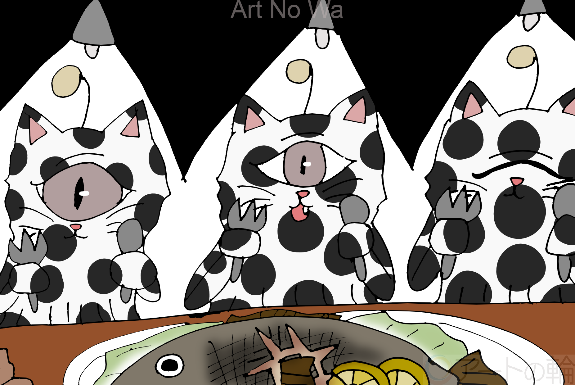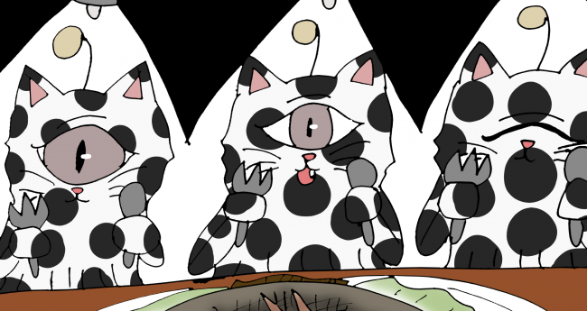 3匹の宇宙人の猫がご馳走の魚を美味しそうに見ている様子を描いてみました。