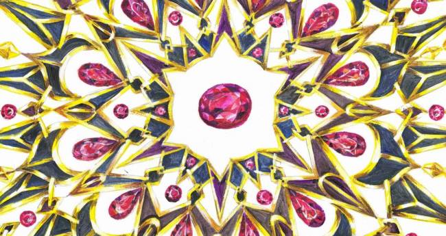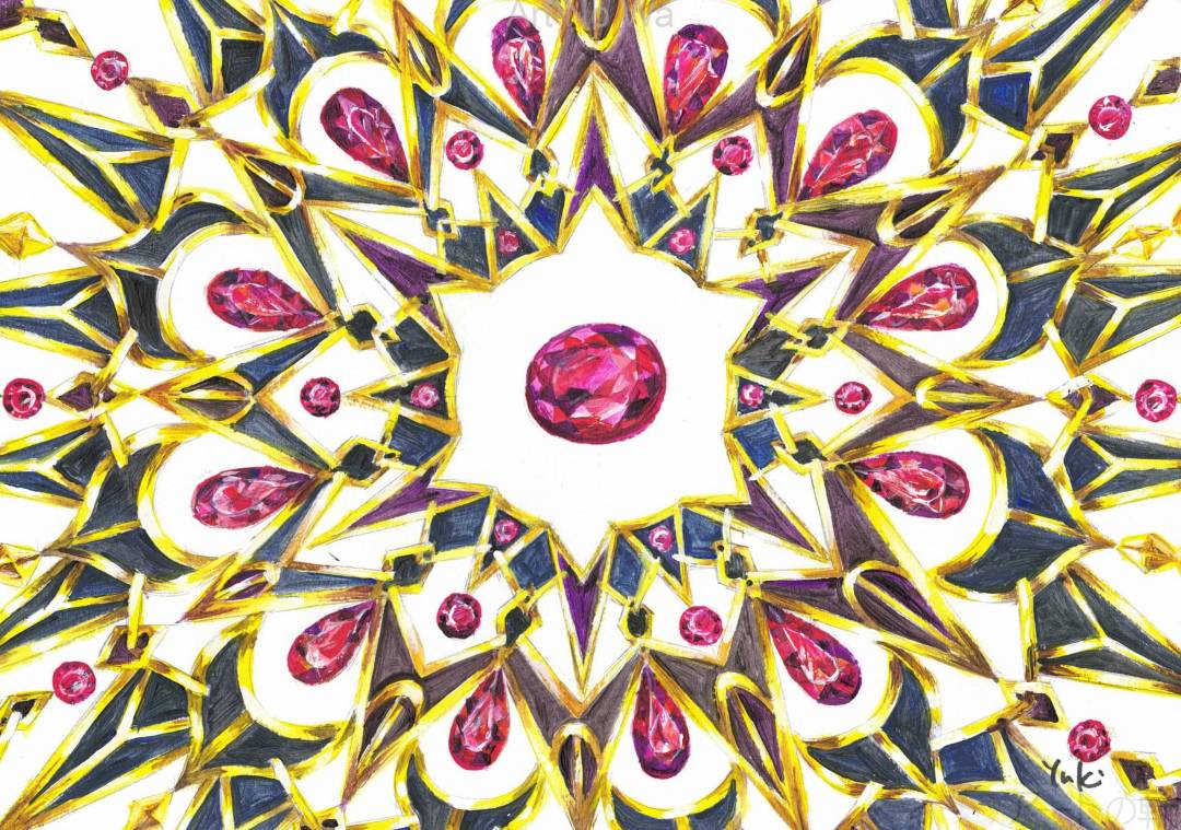 ルビーの宝石言葉の「永遠の命」のイメージで描きました。永続性をアラベスク文様で描き、脈々とつながる命の流れが、美しいルビーのルースが源となる。そんなイメージです。