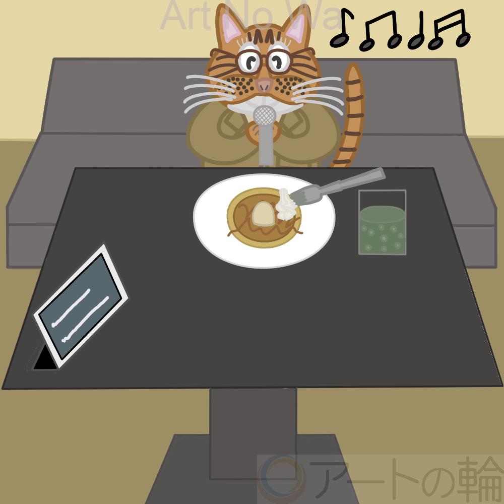 猫がカラオケ店で、食べ物や歌を歌っている所を描きました。オリジナル作品です。