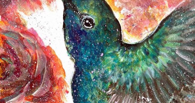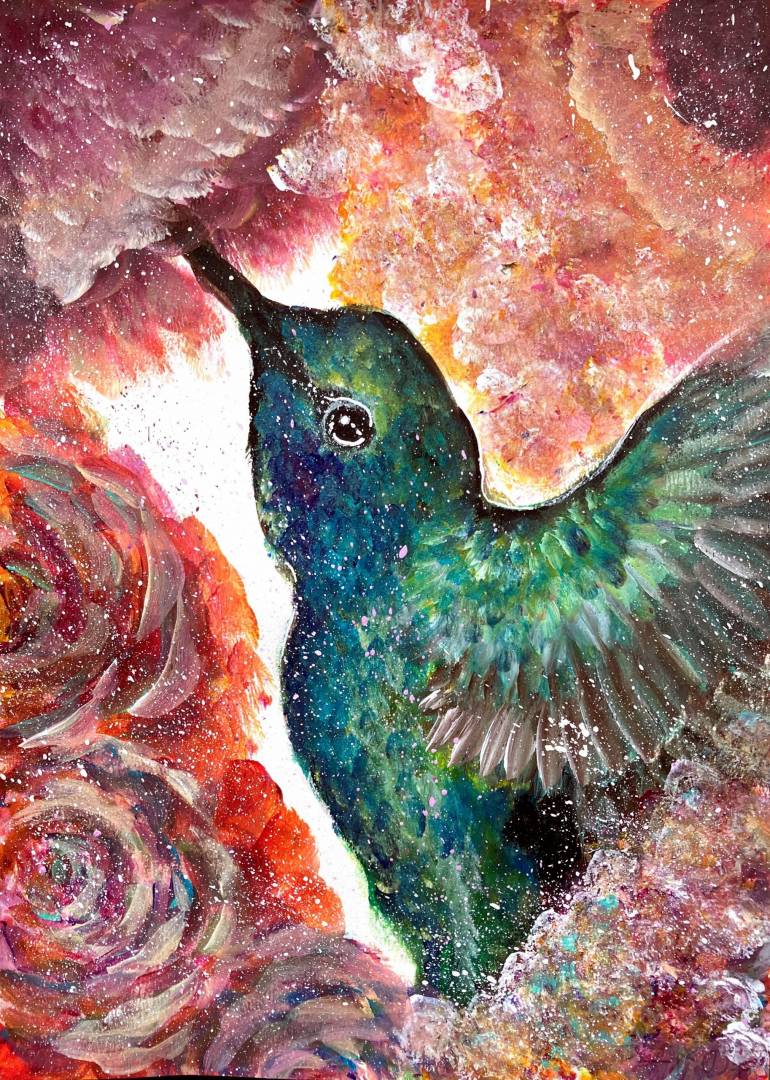 ハチドリが花に囲まれて蜜を吸う様子を描きました。優雅さと、可憐な感じが好きです。