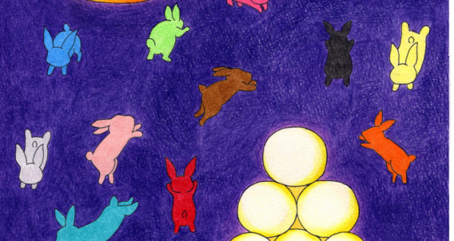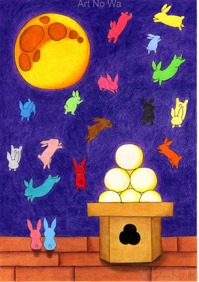 十五夜にうれしくなって夜空を跳ねまわるうさぎたちを描きました。