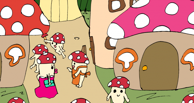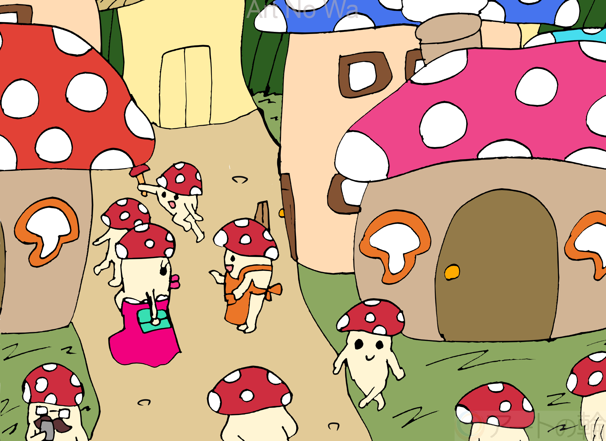 色んなキノコの精霊達が楽しそうにキノコの屋根が特徴な街を歩いている様子を描いてみました。