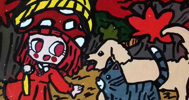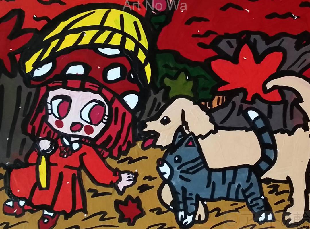 犬と猫を連れてキノコの傘を差しながら秋の景色を散歩している女の子を描いてみました。